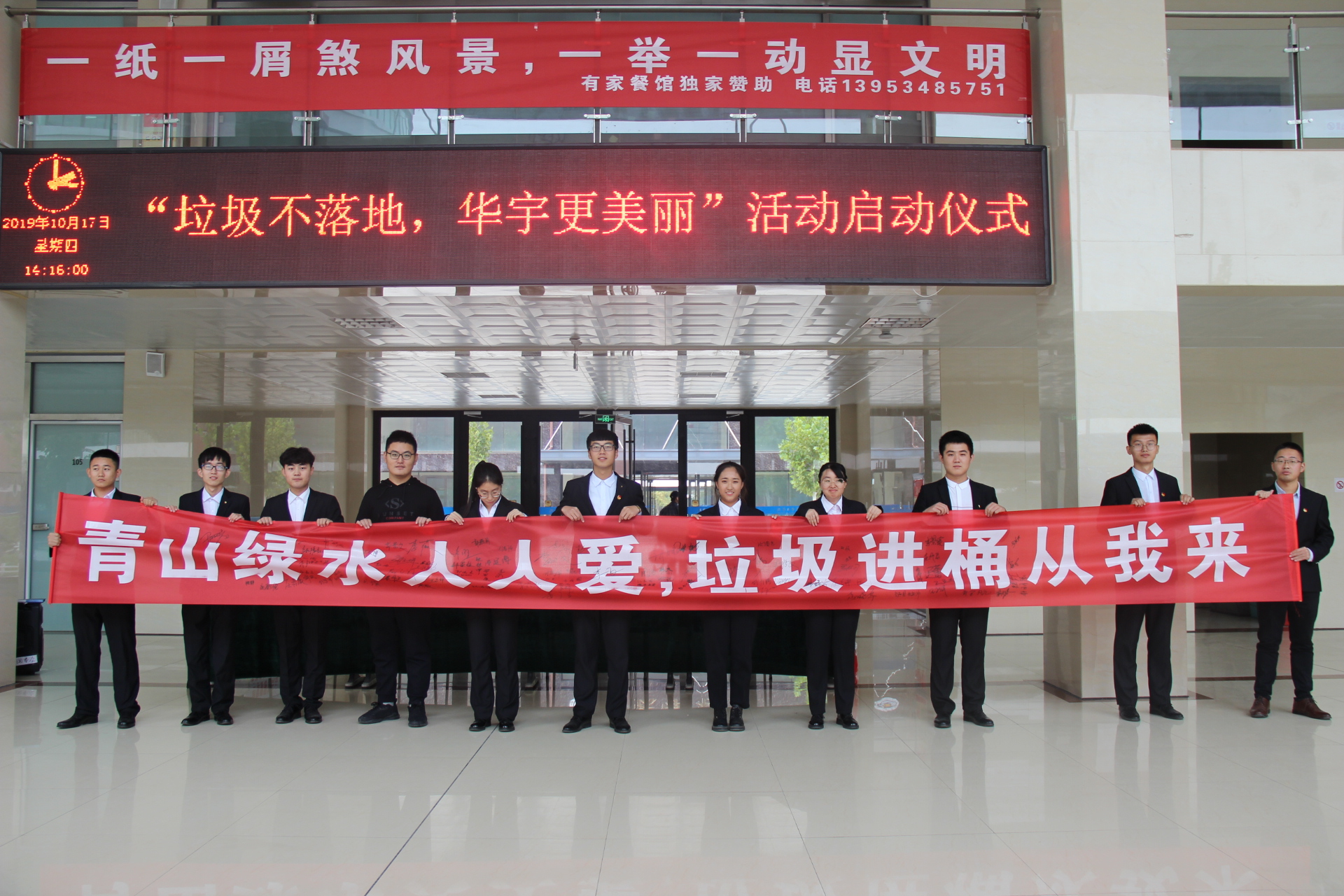 本次启动仪式拉开了我院“垃圾不落地,华宇更美丽”主题活动的序幕。在启动仪式上学生代表赵化斌上台宣读倡议书,希望同学们能够从身边做起,从小事做起,以主人翁的姿态投入到环保工作中,为创建绿色校园贡献自己的一份力量。随后李玉凤院长发表倡议讲话,作为新时代的大学生,要学会自律、自我管理,锤炼优秀品质,希望同学们在学习生活中树立环保意识,为建设美丽校园做出自己的贡献。最后全体领导和学生代表在横幅上签字。